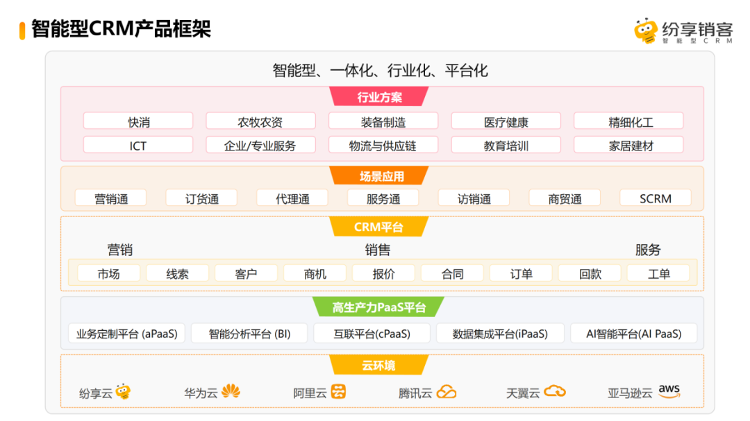 纷享销客的产品功能通过PaaS平台的强大定制能力,沉淀出针对不同行业的场景化应用。