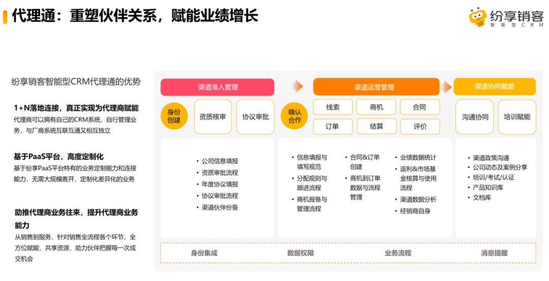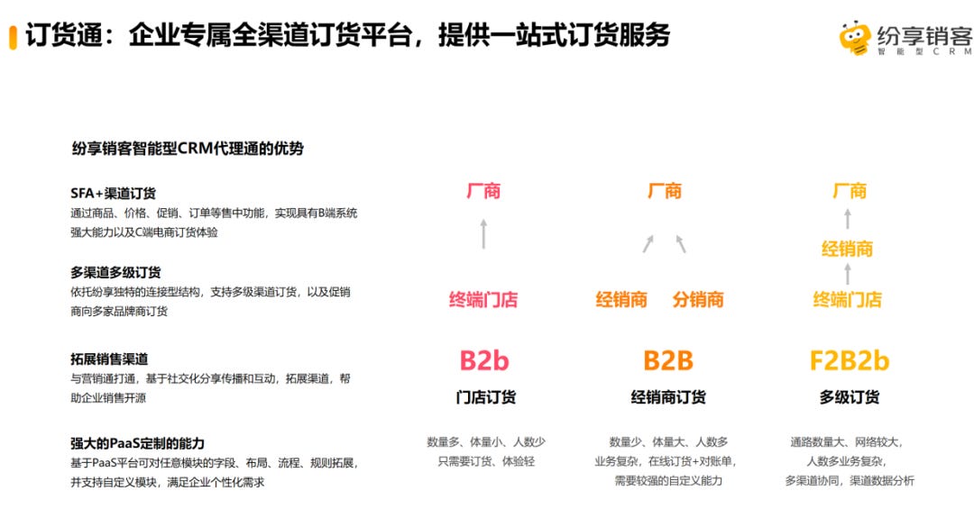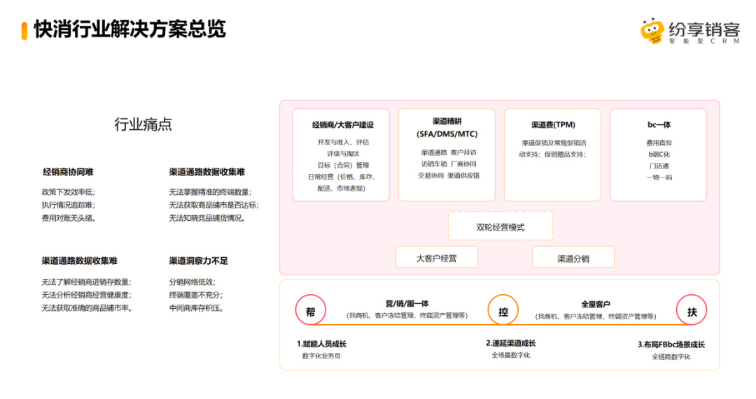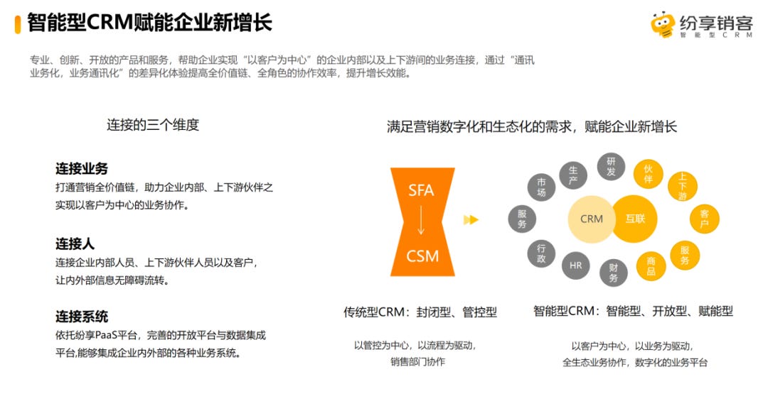 纷享销客智能CRM创领者,中国ToB SaaS CRM的领先品牌。以智能型CRM为特色,通过连接业务、连接人、连接系统,帮助企业实现以客户为中心的,企业内部和上下游业务的高效协作。纷享销客坚持行业深耕战略,为高科技、现代服务、快消、农牧、制造等行业的大中型企业,提供深度行业化的产品、方案和服务,助力企业建设营销、销售、服务一体化、数字化、智能化的平台能力和经营能力。公司创立于2011年,十余年积累,厚积薄发,目前已经为招商局集团、海信集团、神州数码、东软集团、振德医疗、欧普照明、元气森林、好丽友、牧原股份、恒兴集团等6000多家大中型企业提供数字化增长服务。