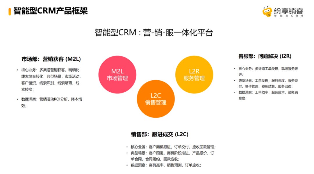 智能型CRM打造了营-销-服一体化平台,推动企业不同部门的职能与协作: