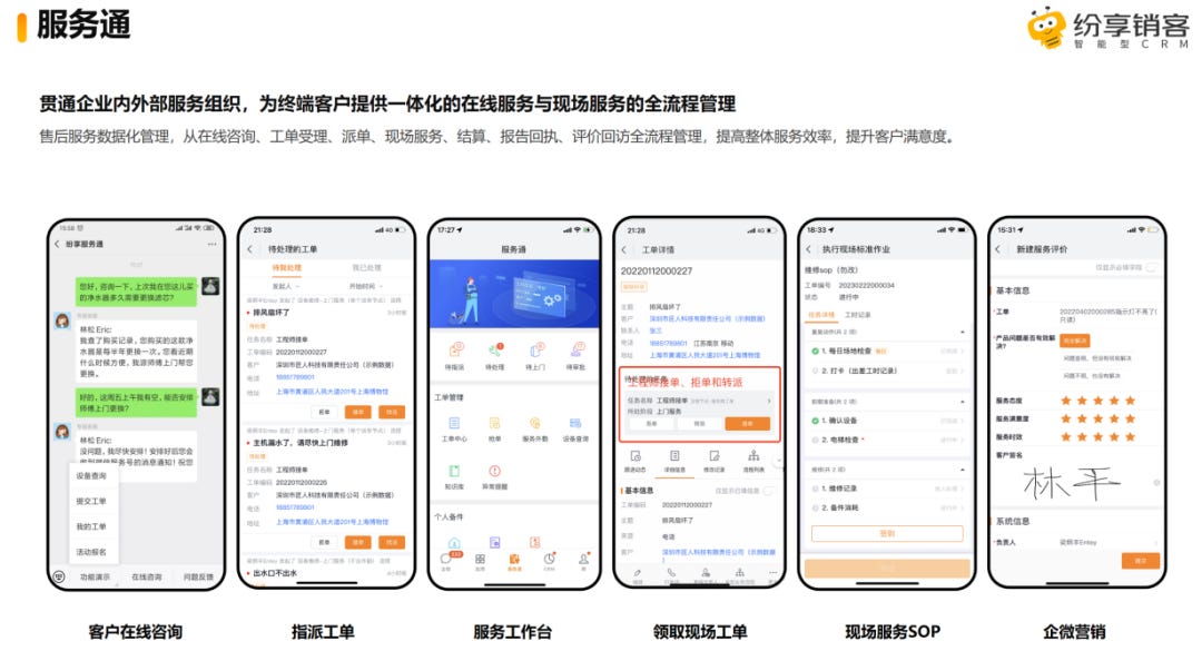 3.服务场景:对于售后服务管理,纷享销客的CRM提供了在线咨询、工单受理、派单、现场服务、结算及评价回访的全流程管理。服务团队可以通过系统提高服务效率,实时跟踪服务进度,提升客户满意度。