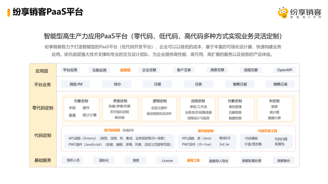 纷享销客的智能型高生产力应用PaaS平台是产品差异化的核心,支持零代码、低代码、高代码多种方式实现业务灵活定制。企业可以以极低的成本,基于丰富的可视化设计器,快速构建业务应用。依托底层强大技术支撑和专业的交互设计团队,为企业提供高性能、高可用、高扩展的服务以及极致的产品体验。