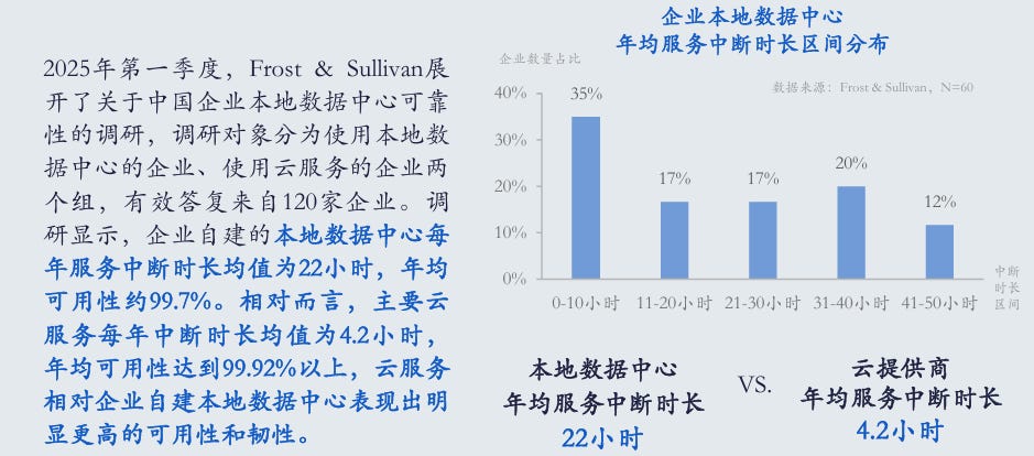 企业对于“云是否足够稳定”的判断,长期以来往往受到对本地数据中心可控性的预期影响。然而白皮书指出,自建本地数据中心的平均年中断时长高达22小时,可用性仅为99.7%。相较之下,主流云服务商在过去两年半的平均年中断时长为4.2小时,可用性普遍在99.92%以上。