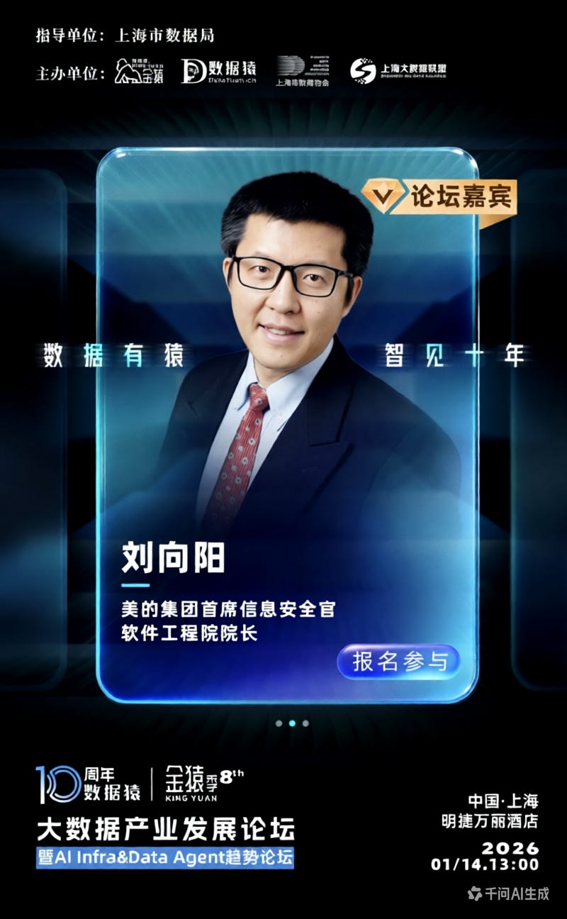 美的集团首席信息安全官兼软件工程院院长 刘向阳,已确认出席由上海市数据局作为指导单位,金猿组委会×数据猿×上海市数商协会×上海大数据联盟联合主办的“第八届金猿大数据产业发展论坛 —— 暨AI Infra & Data Agent趋势论坛”。