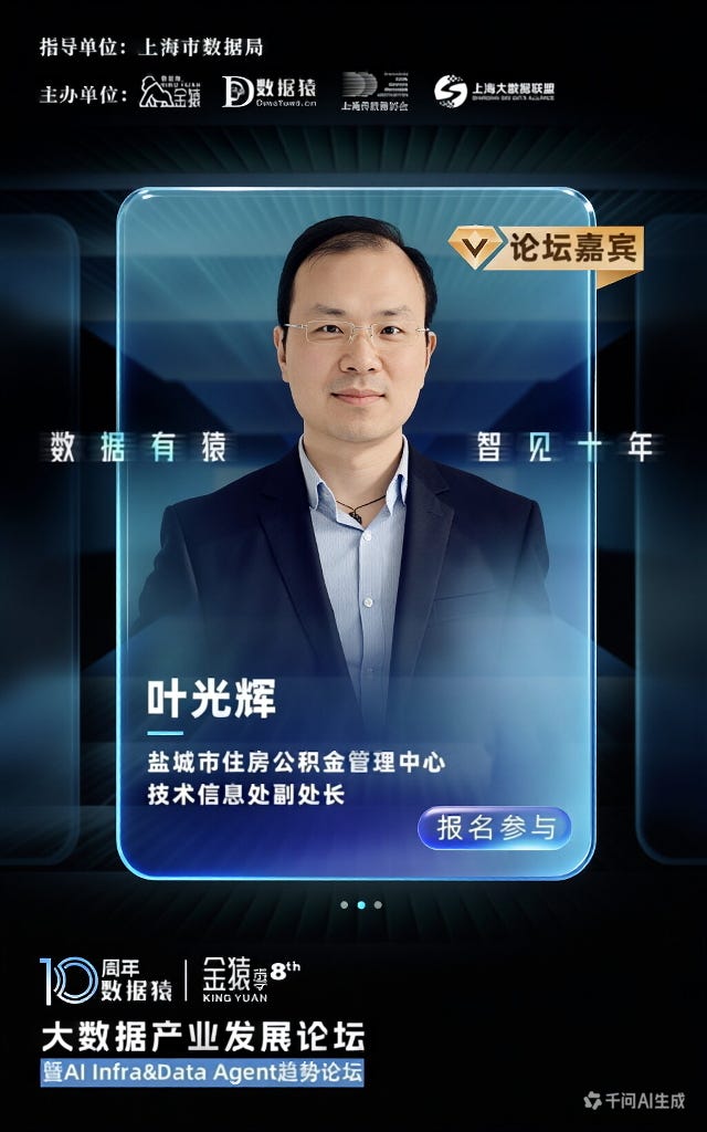 盐城市住房公积金管理中心技术信息处副处长 叶光辉,已确认出席由上海市数据局作为指导单位,金猿组委会×数据猿×上海市数商协会×上海大数据联盟联合主办的“2025第八届金猿大数据产业发展论坛 —— 暨AI Infra & Data Agent趋势论坛”。