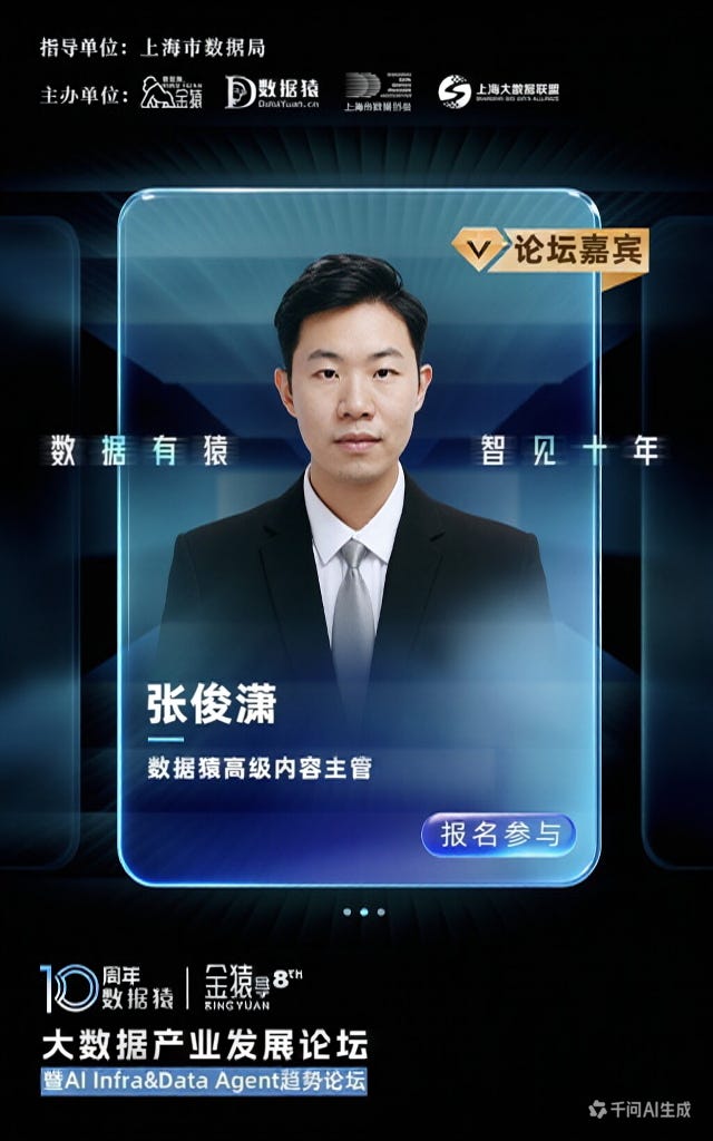 数据猿高级内容主管 张俊潇,已确认出席由上海市数据局作为指导单位,金猿组委会×数据猿×上海市数商协会×上海大数据联盟联合主办的“第八届金猿大数据产业发展论坛 —— 暨AI Infra & Data Agent趋势论坛”。