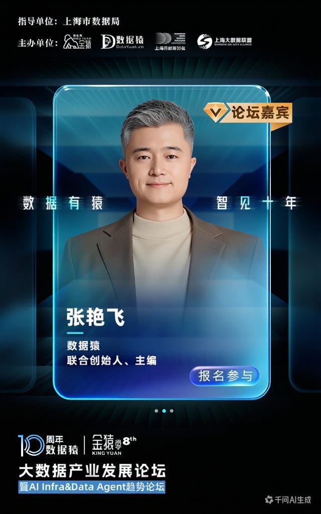 数据猿联合创始人、主编 张艳飞,已确认出席由上海市数据局作为指导单位,金猿组委会×数据猿×上海市数商协会×上海大数据联盟联合主办的“第八届金猿大数据产业发展论坛 —— 暨AI Infra & Data Agent趋势论坛”。