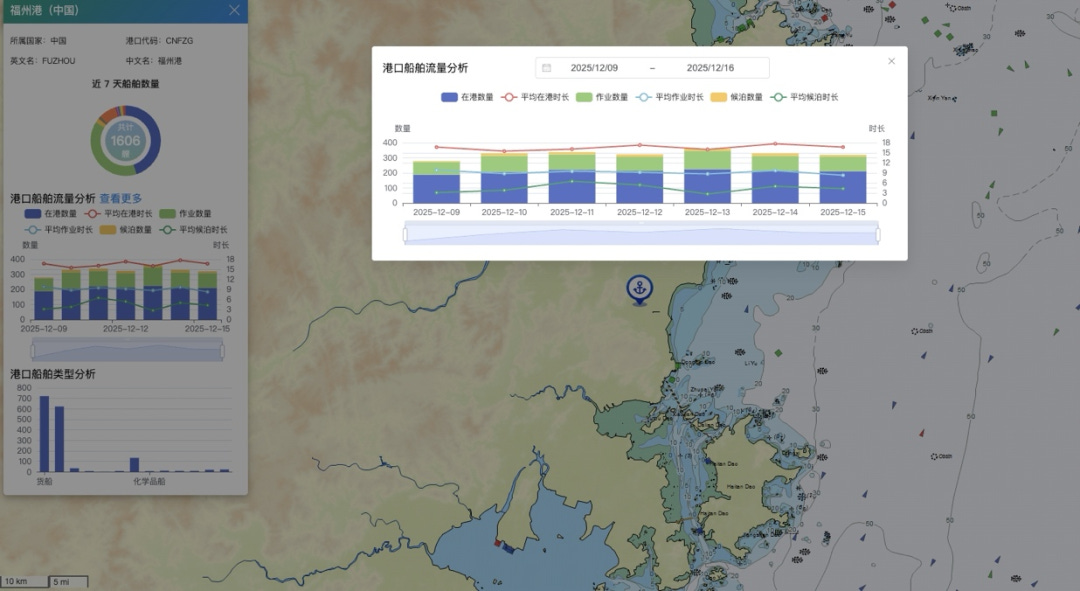 港口详情模块提供三大核心数据:实时天气与潮汐预报、在港船舶动态(分靠泊/锚泊/在航状态)、7日内港口流量趋势。2025年新增供应链协同看板(如图5),可显示特定货类(如集装箱、散货)的船舶排队情况,并结合历史数据预测未来48小时泊位利用率。