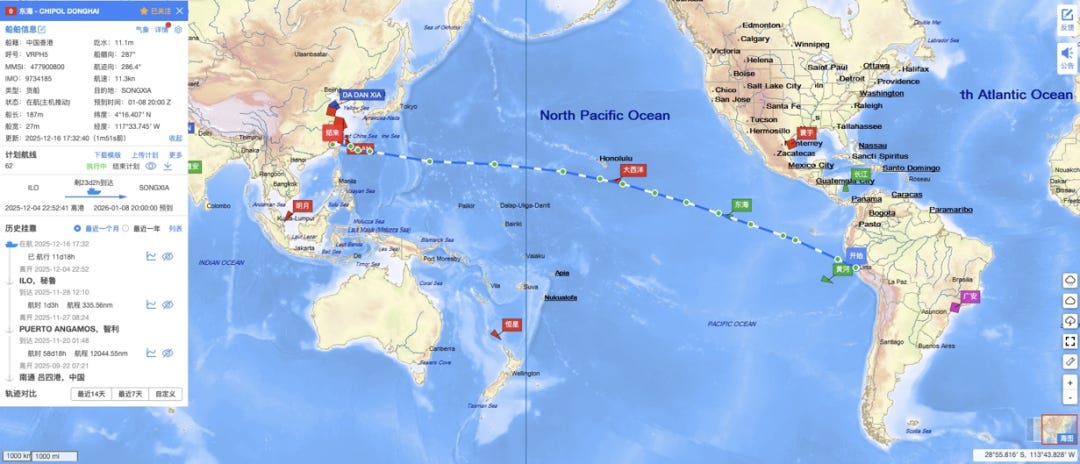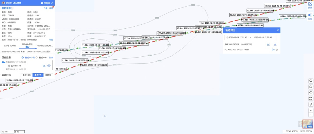 历史轨迹模块支持2016年至今的数据查询与导出,2025年新增轨迹对比分析工具(如图6)。用户可选择多艘船舶的同期轨迹,系统自动生成航线重合度、平均航速对比等分析报表,为海事调查、运营效率评估提供量化依据。