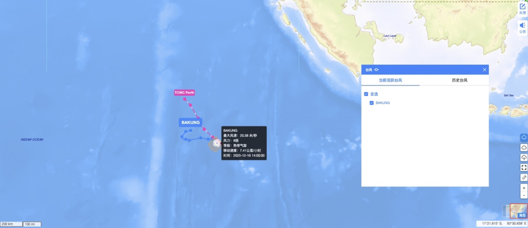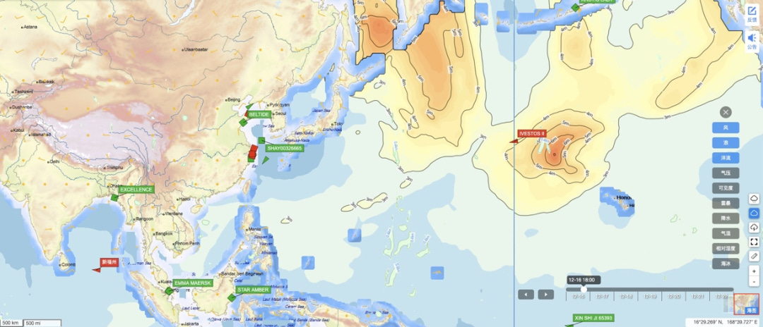 平台集成全球气象机构数据,提供台风、沿海气象、海洋气象三类服务。台风模块包含当前路径预报和历史台风查询,支持粒子动画展示台风强度演变(如图2)。2025年新增气象影响分析功能,当台风路径与船舶航线存在交汇可能时,系统自动计算受影响时间窗口,并推荐避风方案。
