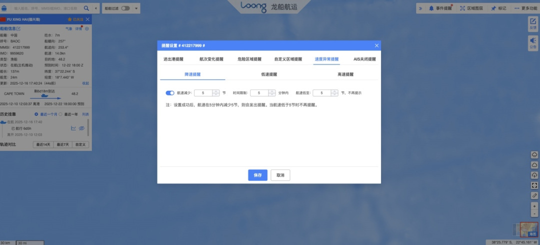 平台构建了包含动态信息、区域提醒、速度异常等6大类预警体系。2025年对速度异常算法进行优化,新增加速度变化率监测维度,可识别缓慢降速等隐蔽异常行为。如图4所示,用户可对单船或船组设置分级阈值,如设置”5分钟内降速超5节”时触发高级别报警。