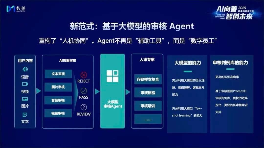审核Agent的引入彻底改变了这一模式。“Agent不再是‘辅助工具’,而是‘数字员工’。”梁堃重新定义了人机关系。这些数字员工具备语义理解、逻辑推理、Few-shot学习和不确定判断能力,能够像经验丰富的审核专家一样工作。