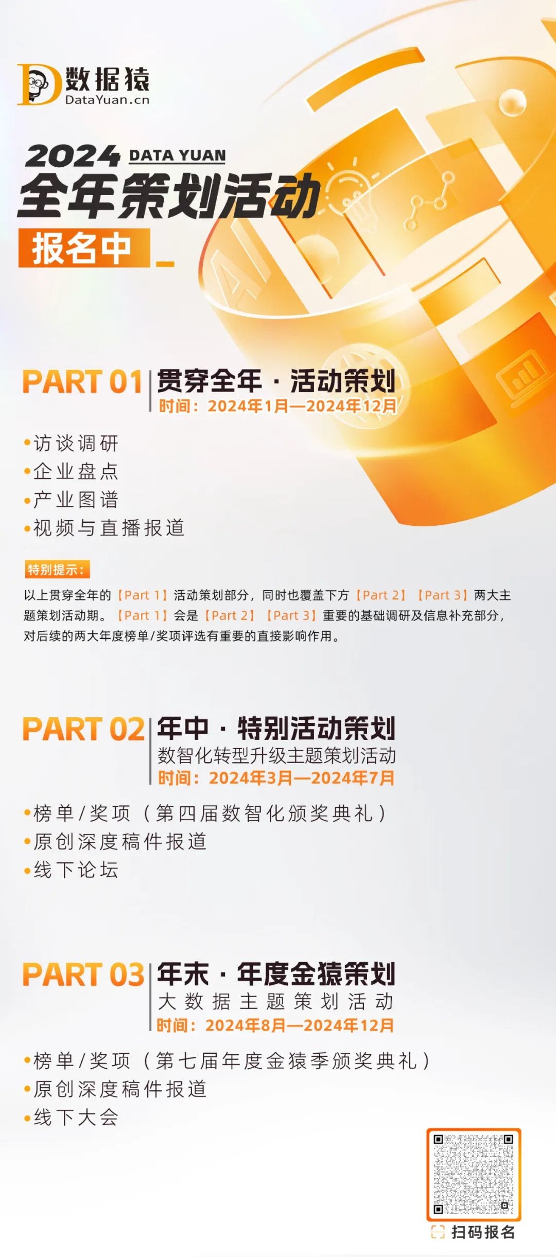 2024年,数据猿基于历年推出的各主题策划活动,再次迭代升级,对外公布横跨全年的三大策划活动,欢迎各方报名参与: