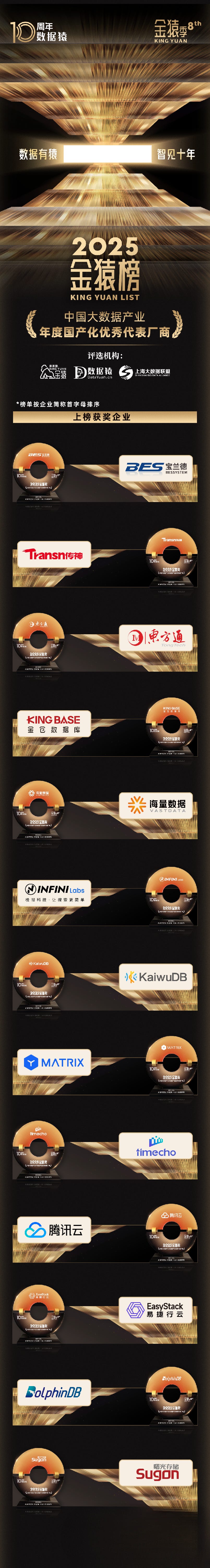 “第八届年度金猿季策划活动——《2025中国大数据产业「年度国产化优秀代表厂商」》榜单/奖项”由金猿组委会X数据猿X上海大数据联盟共同推出。