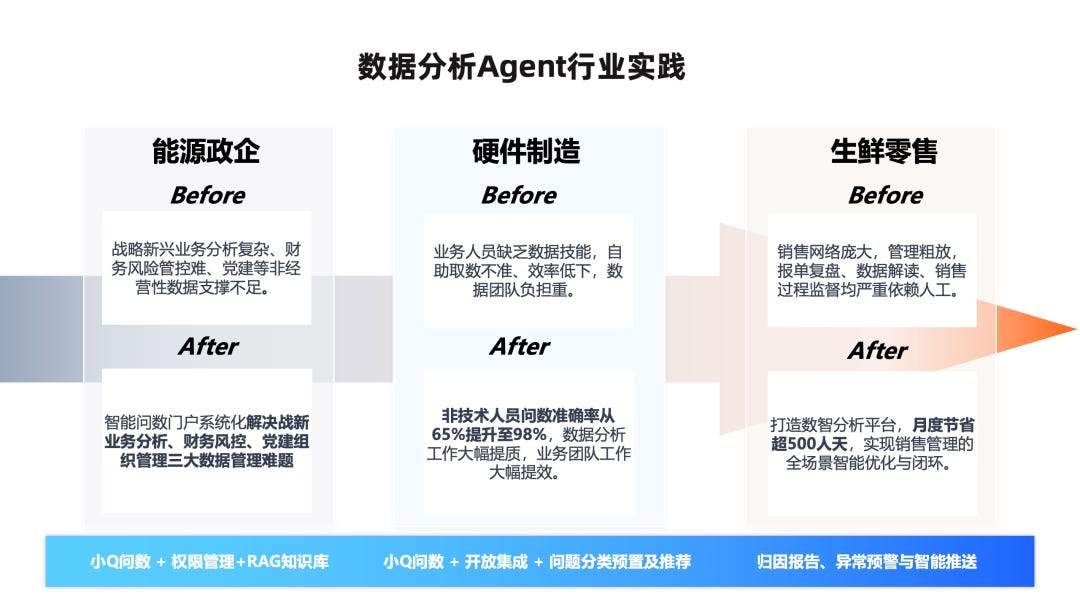 本篇白皮书中详细介绍了目前数据分析Agent在能源、制造、零售等多个行业头部企业的落地实践。