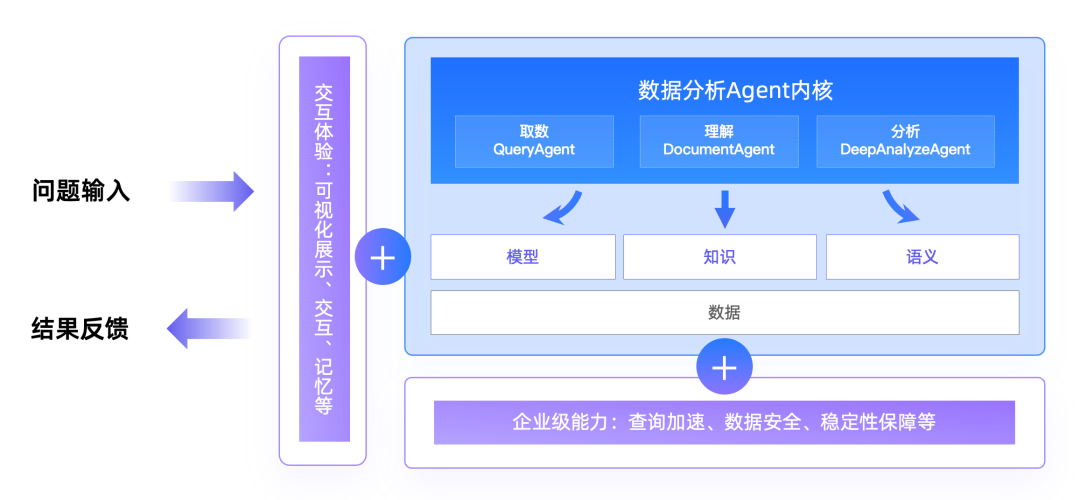 除了技术内核,要解决取数类问题、分析类问题并广泛落地,必备一个强大的端到端应用框架。因此需要搭配用户级交互体验的工程能力,比如数据可视化展示与交互、企业级加速引擎、数据安全的管控及稳定性保障。