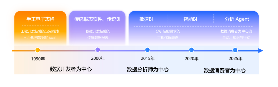 除了AI技术带来的革命性突破以外,数据分析Agent的出现也是数据分析行业数十年技术迭代与业务需求升级的必然结果。行业发展历程可划分为三个阶段,每一轮演进都围绕着降低使用门槛、提升分析效率、深化数据价值的核心目标展开,最终指向了Agent驱动的智能助手。