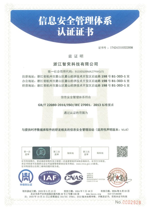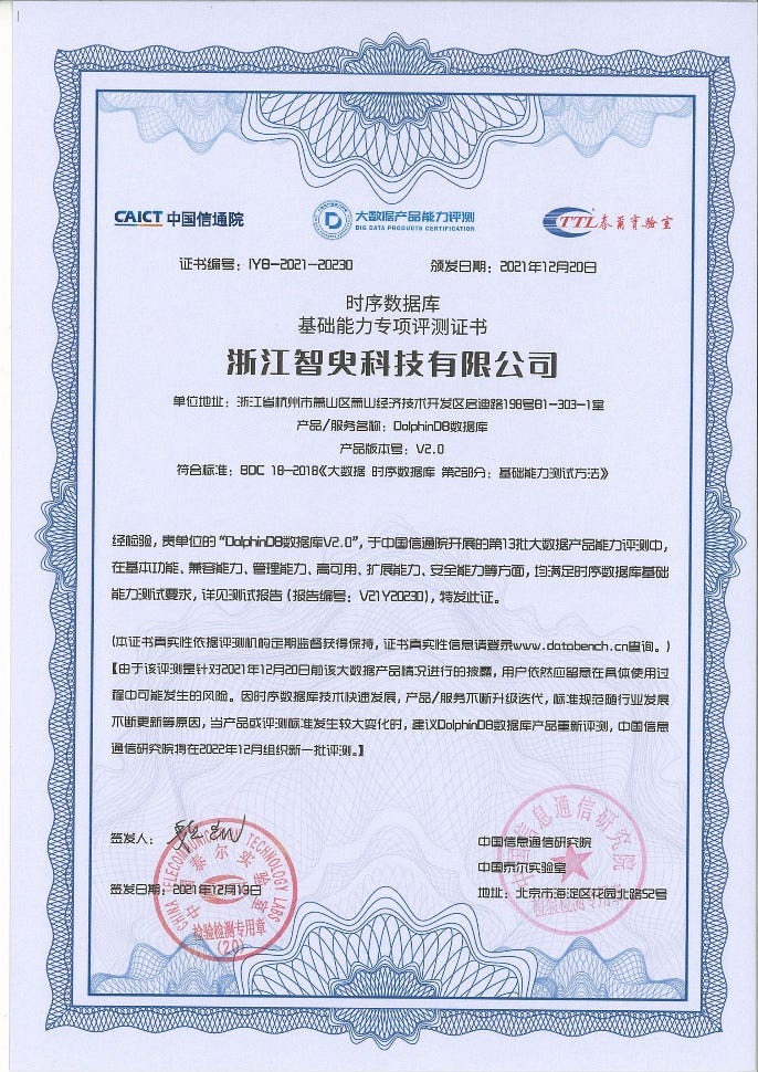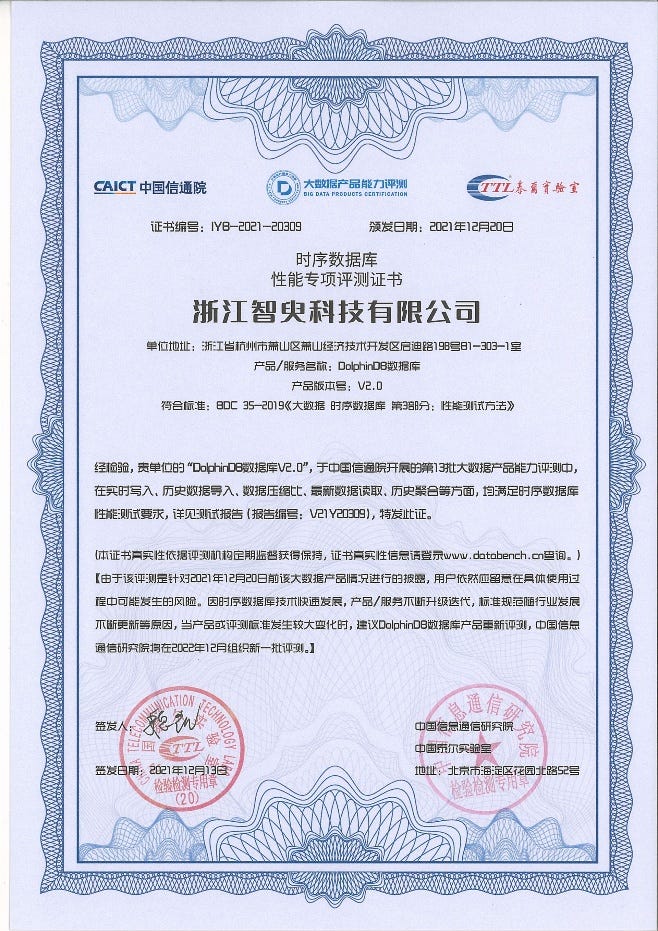 2.中国信通院时序数据库性能专项评测证书