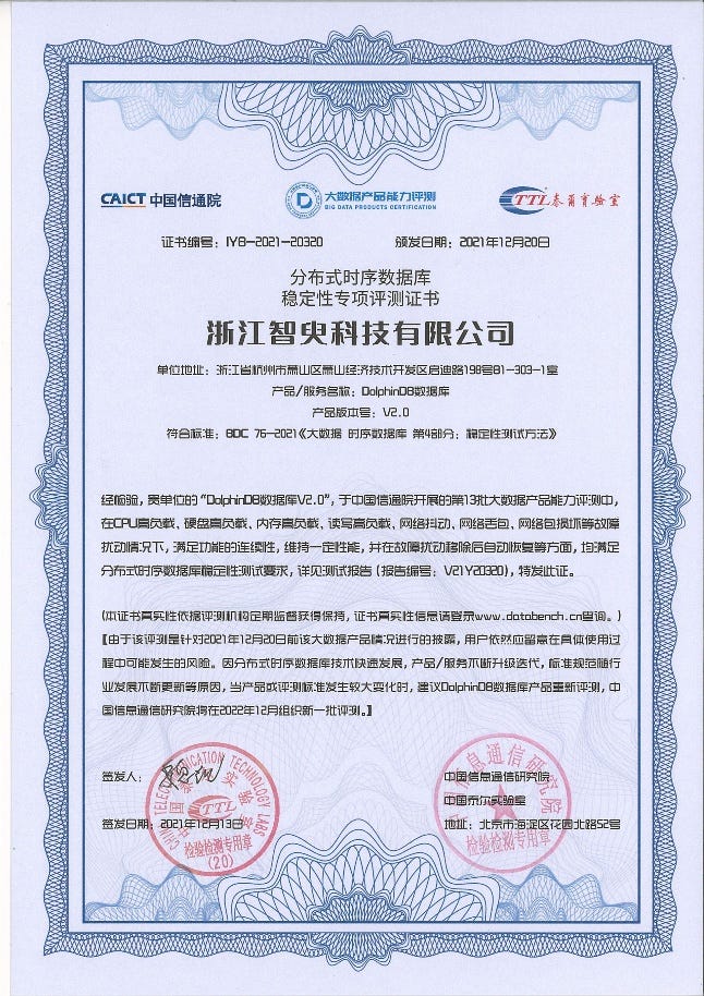 1.中国信通院分布式时序数据库稳定性专项评测证书