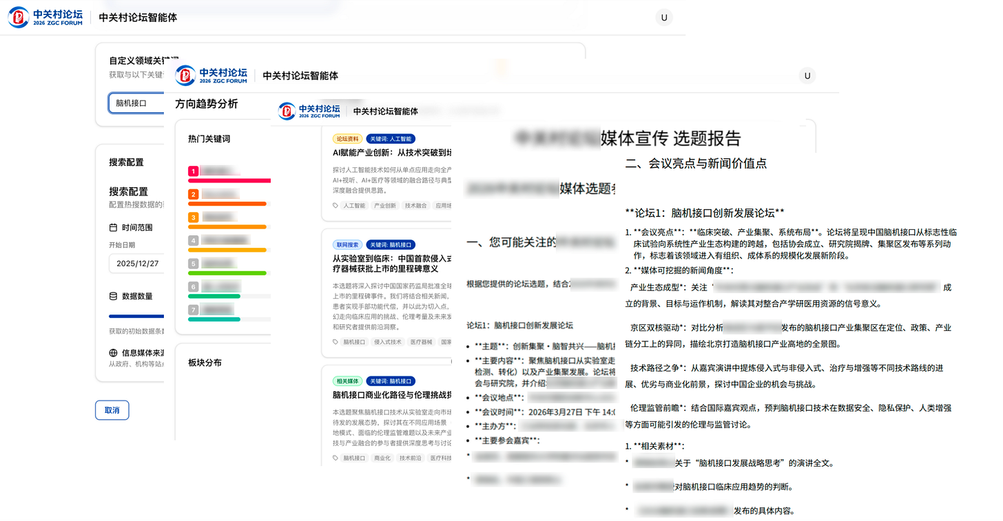 二是智能选题应用。针对论坛高规格会议密集、策划统筹工作量大的核心痛点,整合外部前沿方向、舆情热点动态与内部会议纪要、嘉宾资源等核心信息,精准捕捉行业动态,为论坛整体策划、媒体宣传素材筹备、稿件撰写等核心业务提供全链路支撑,提升会议策划的落地效率。