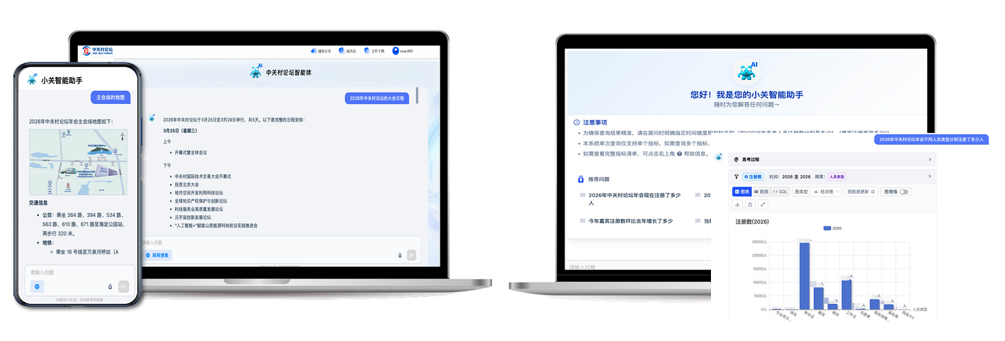 一是小关智能助手。针对论坛活动信息、行程安排、参会人员注册、证件管理、成果数据等核心业务数据,该助手通过自然语言交互,即可为参会人员及工作人员提供智能咨询、业务数据深度洞察、多维度统计分析等核心功能。