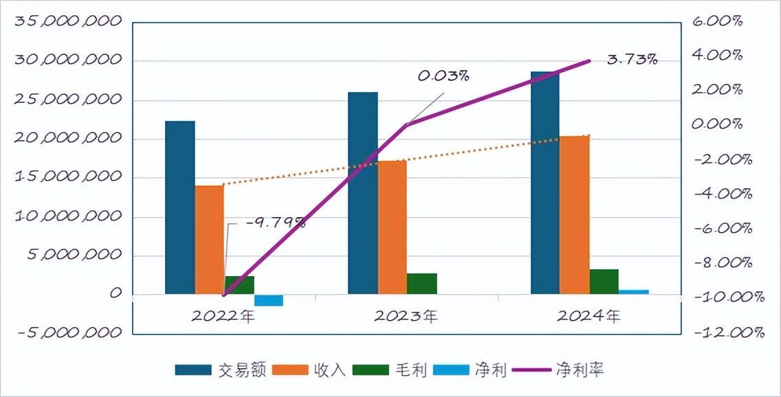 自2022年至2024年近三年间,京东工业的交易额由约人民币(后同)223亿元增至288亿元,复合年增长率为13.5%。收入则由2022 年的141亿元增至2024年的204亿元,复合年增长率达20.1%,从利润来看,2022年净亏损人民币13亿元,2023年扭亏为盈,获得480万元净利润,到2024年净利润则达到7.6亿元。