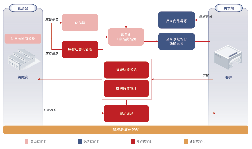 来源:灼识咨询报告、京东工业招股说明书只有第一层还无法实现真正的数智化,京东工业紧接着又做了第二层部署,即根据供应链的特点继续分解为“商品数智化”、“采购数智化”、“履约数智化”和“运营数智化”。在“商品数智化”中,面对工业品非标、SKU繁杂等挑战,京东工业自主打造了“墨卡托商品库”,对海量商品参数进行标准化与结构化,还实现了商品与供应商的解耦,显著降低了供需双方的沟通与交易成本。在“采购数智化”中,传统工业品采购流程复杂、信息不透明,京东工业则提供了覆盖全场景的数智化采购系统,支持复杂需求、周期补货及长尾物资采购,依托该系统,京东还提供了丰富的商品选择与专属服务,支持标准化、自动化下单,提升效率与合规管理水平。在“履约数智化”中,京东工业综合分析成本、库存、供货、物流服务和结算周期,智能制定最优履约方案,通过智能调度与“厂直送”模式,有效降低了库存、仓储和运输成本,确保订单精准交付。借助“万仓合一”战略,实现与供给端仓网协同,进一步优化库存配置。