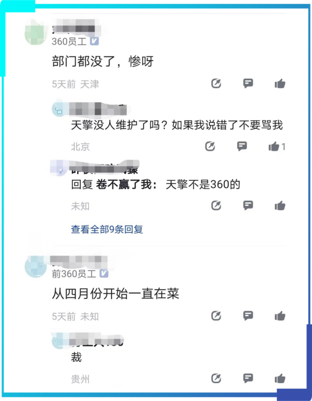 天融信在2023年的财报中披露,过去一年减员444人,亏损3.7亿。中孚信息的财报显示,2023年归母净利润为负的1.86亿,减员446人。奇安信在内部邮件中表示,由于2023年的经营目标未能完全达成,公司决定全年无年终奖金。就连安全领域的老大哥360也是连续两年亏损(大部分亏损是由投资哪吒汽车带来的),截至2023年末,360拥有员工总数5990人,较2022年6481人,减少了7.58%。