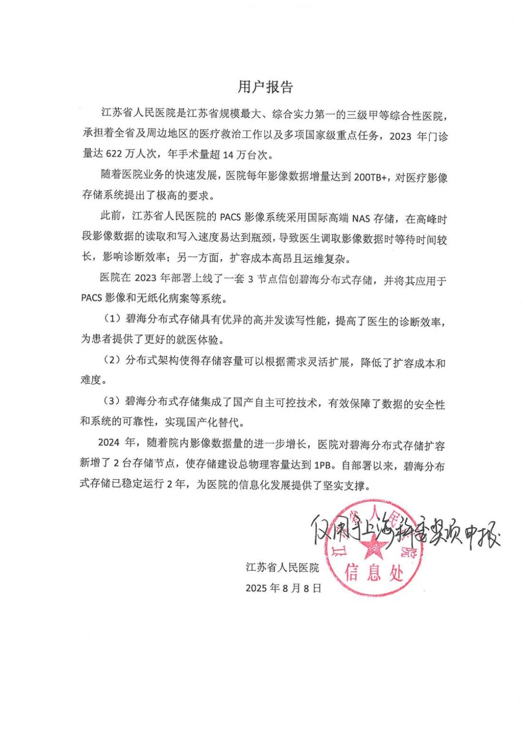 ·2025年:荣登赛迪顾问《中国分布式存储研究报告》医疗市场领导者象限,全国百强医院合作超20家,医疗行业渗透率排名第一。