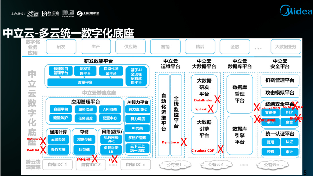 ·中立云基础平台:包括完整的IaaS平台(计算、存储、网络)和PaaS平台,还有一个AI算力平台(支持不同厂商的GPU卡,而且既可以管理自己的数据中心里面采购的GPU,也可以管理公有云上租赁的GPU,而且基于中立云的多云统一能力,自己数据中心GPU不够的时候,任务会自动弹到云上,不需要人的介入)。在美的,中立云自研的操作系统已经替代了RedHat,自研的云服务器已经替代了VMware,自研的分布式块存储软件已经替换了集中式SAN存储硬件设备,自研的负载均衡软件已经替换了硬件F5设备。