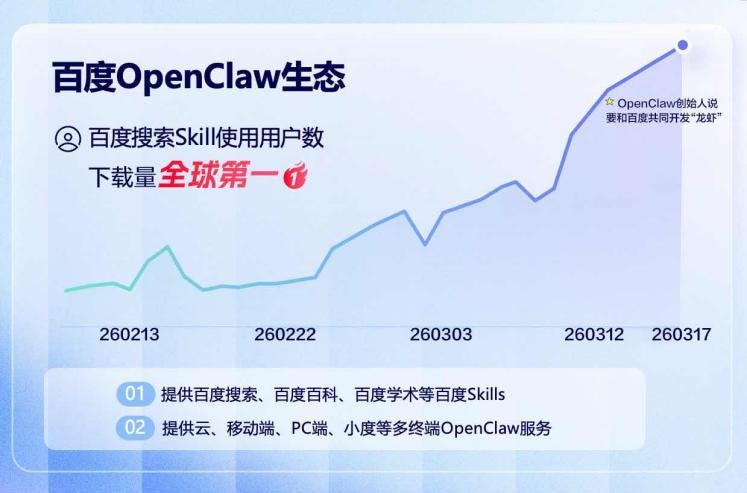 在AI智能体的世界里,搜索不再是用户的主动行为,而是AI的后台能力。谁掌握了这个“能力层”,谁就扼住了智能体生态的咽喉。百度正在做的,就是把积累二十多年的搜索能力,封装成一个个Skills,塞进每一只“龙虾”的身体里。