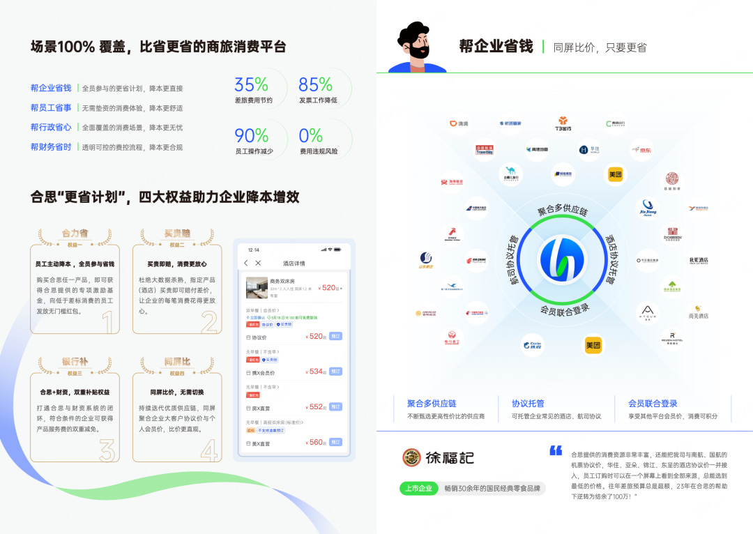 合思商旅作为全场景智能差旅管理平台,始终秉持“技术向善”理念,在提升企业消费管理效率的同时,积极践行社会责任,以数字化能力守护员工安全、推动可持续发展。平台不仅助力企业差旅费用节约35%、发票处理工作量下降85%,更通过“买贵赔”机制保障消费公平,借“合力省”引导主动节约,共建低碳办公文化。