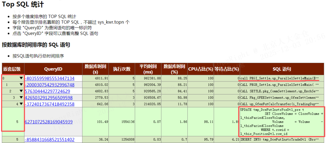 通过自主研发的性能管理模块(KWR),实现了对存储过程的深度下钻分析能力:运维人员可通过KWR报告,直接穿透存储过程的“黑盒”,下钻查看每一条内部执行语句的数据库时间、执行次数、资源占用等关键指标,精准定位耗时节点。这种“精准到行”的性能诊断能力,让运维从“大海捞针”转变为“探囊取物”,不仅大幅缩短问题排查时间,更能帮助企业持续优化存储过程性能,让核心业务系统始终保持高效运行,为用户体验保驾护航。