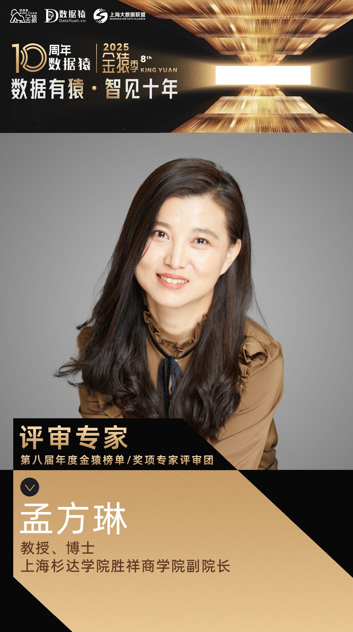 【终审团专家公告】上海杉达学院胜祥商学院副院长孟方琳,已确认成为“2025第八届年度金猿”榜单/奖项评审团专家评委,并将授予评委荣誉证书。