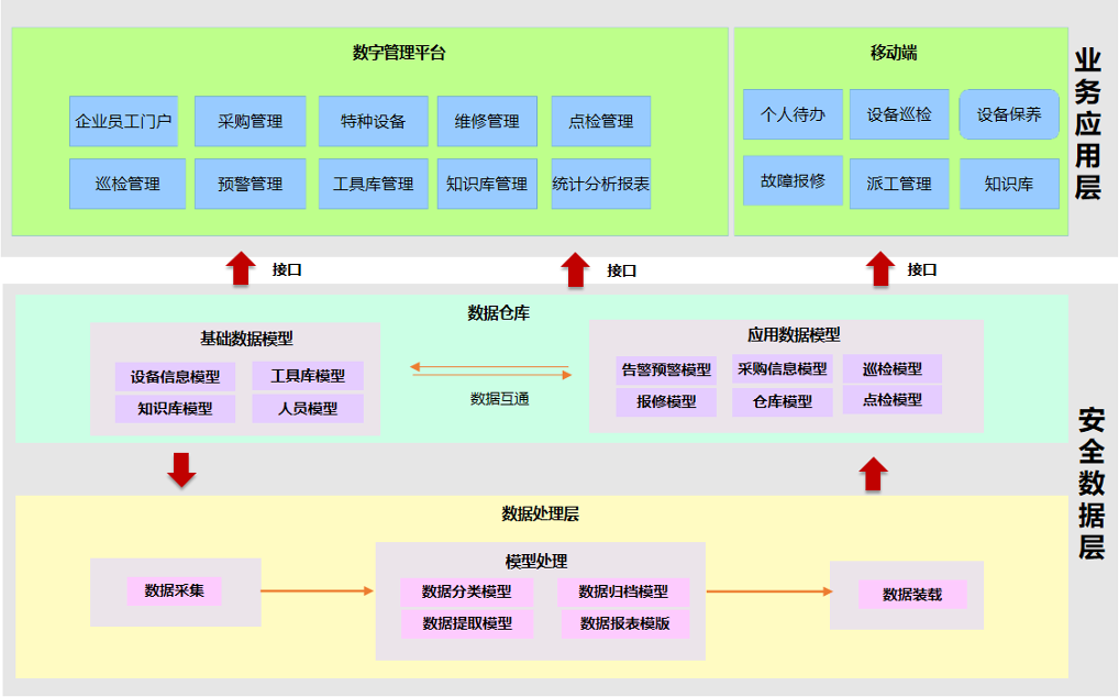 建立在基础设施平台之上是系统的数据处理层,整体基于设备等数据的采集、基本信息的录入等把数据进行分类、提取、归档等操作。基于这些数据,系统抽象出基础数据模型、应用数据模型,两个模型数据可以进行互通,构成了数据中台职能;整个从数据的入口到数据可用,保障整个数据层的安全。