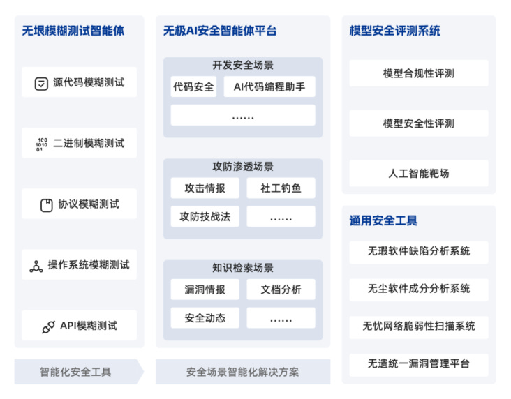 ● 无极AI安全智能体平台:无极AI安全智能体平台融合了AI技术与安全智能体的先进理念,打造了一个集成安全知识、代码安全和安全工具的全能平台。该平台为用户提供了一个全面的安全技术支持和解决方案库,旨在帮助用户应对网络安全威胁、代码漏洞风险以及安全工具治理过程中的复杂性和挑战。