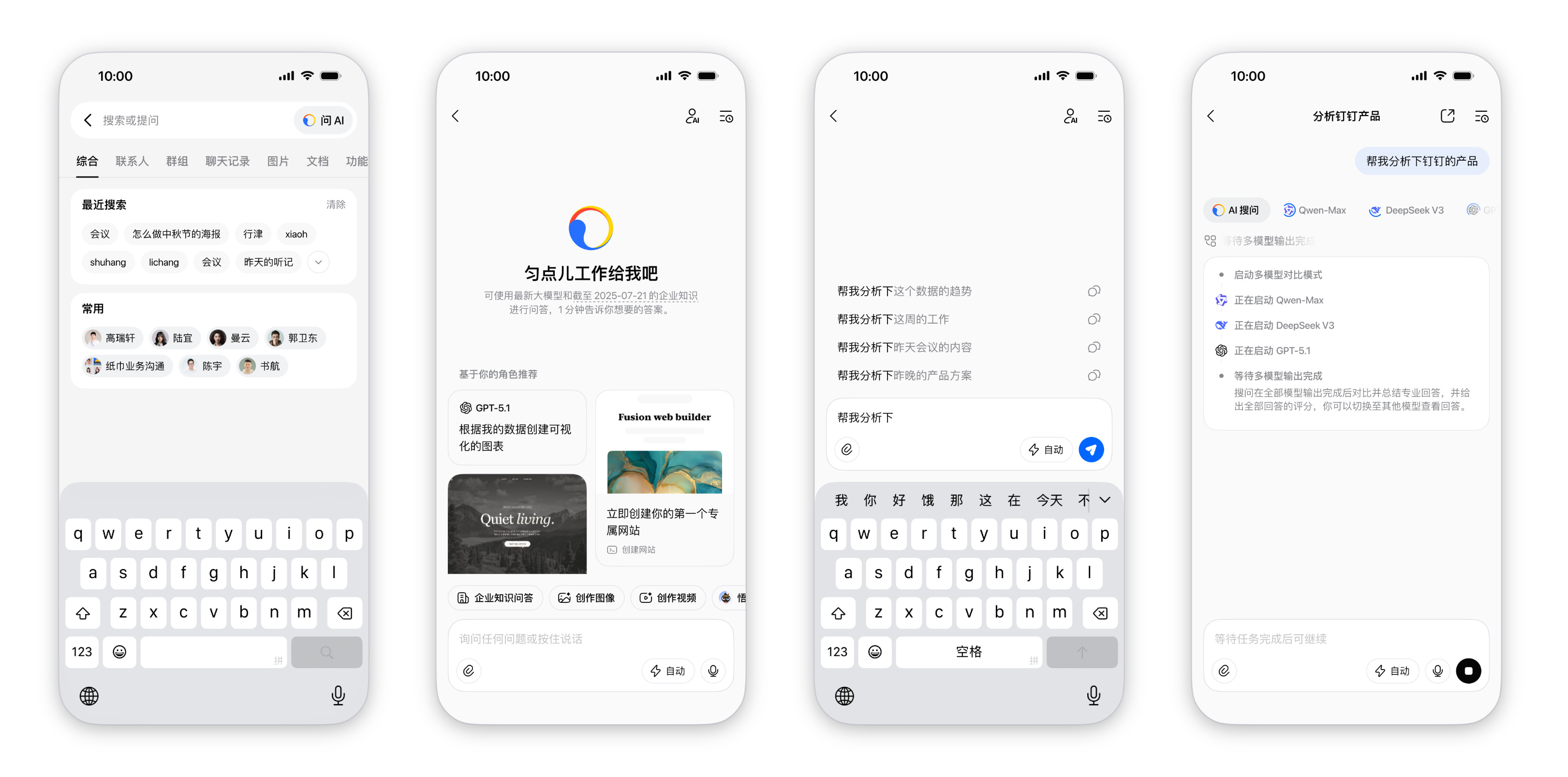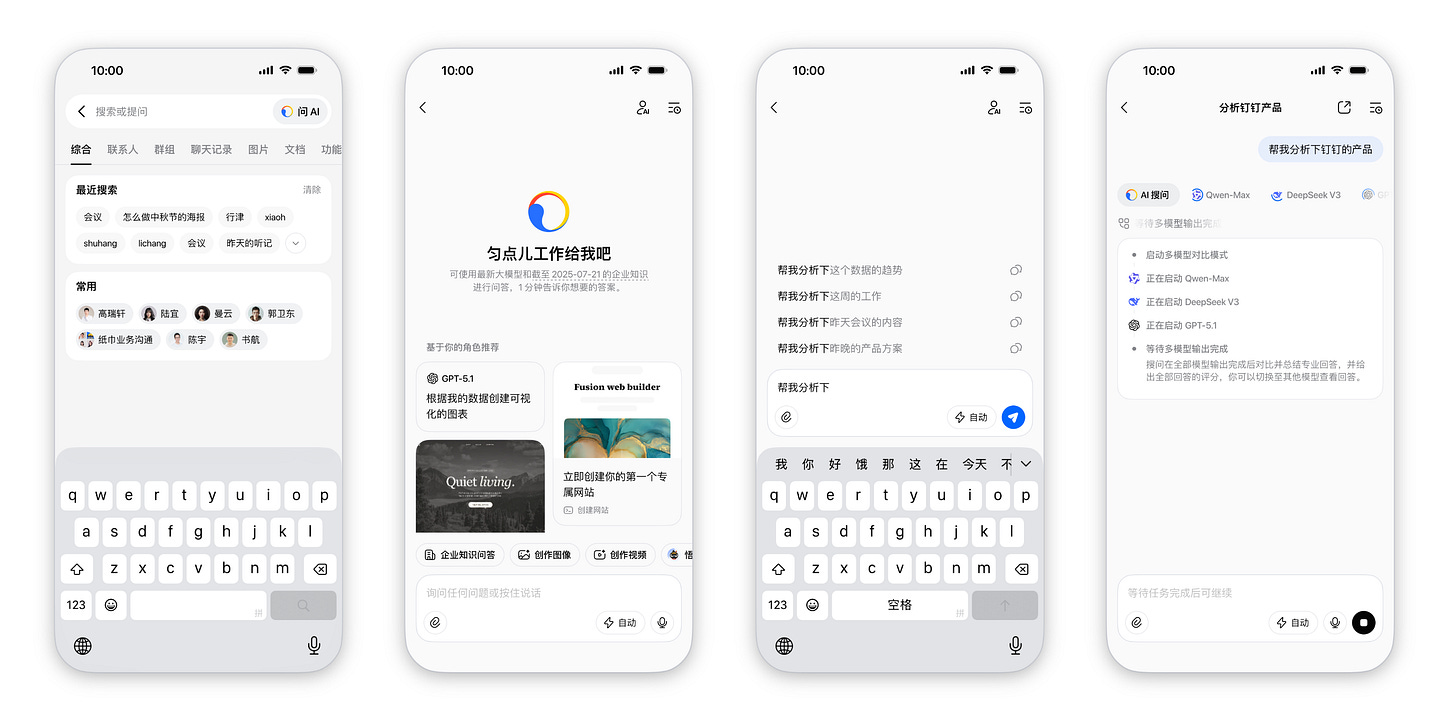 “AI搜问”升级为“能搜、能问、能干活”的企业级AI搜索引擎。“能搜”帮助企业在AI听记、AI表格、知识库等数据中安全实现“一搜即得”;“能问”集成主流大模型,用户合规选择模型问答,并可对多模型进行归纳;此次新发布的“悟空”作为通用Agent,真正实现“从问答到干活”,自动接管任务,自主规划,调用钉钉各类工具与Agent高效完成复杂任务