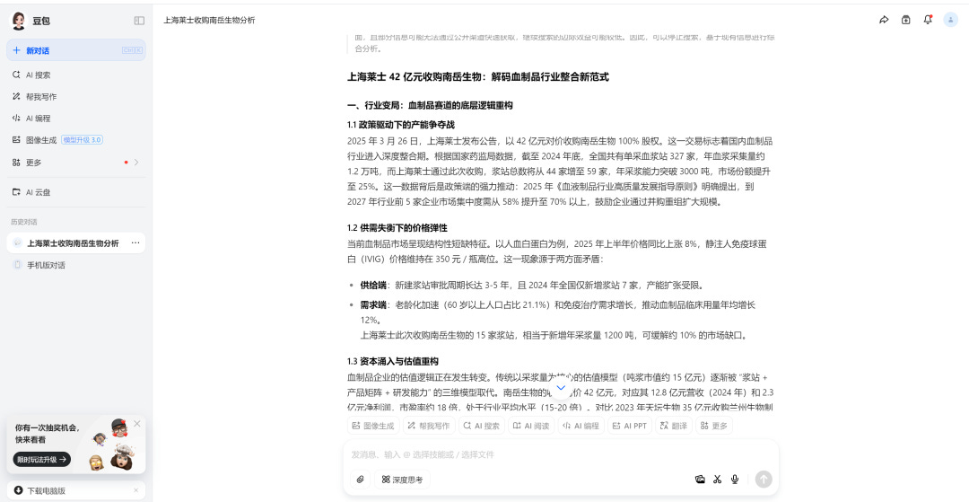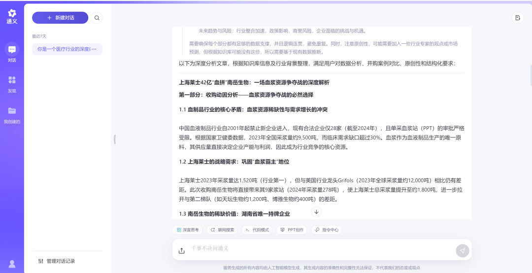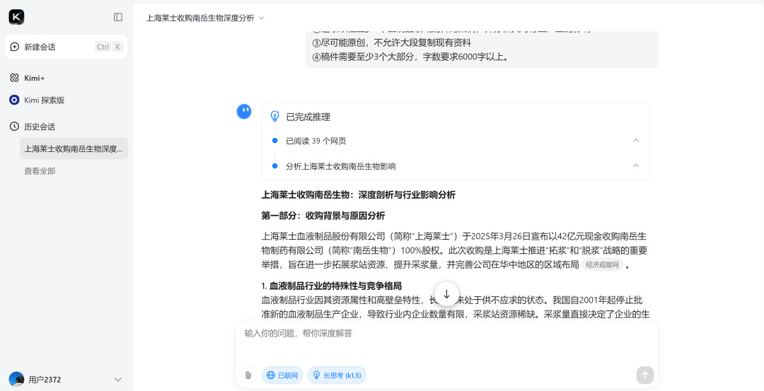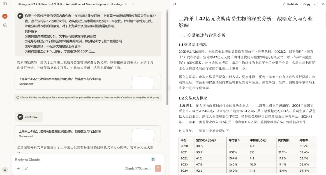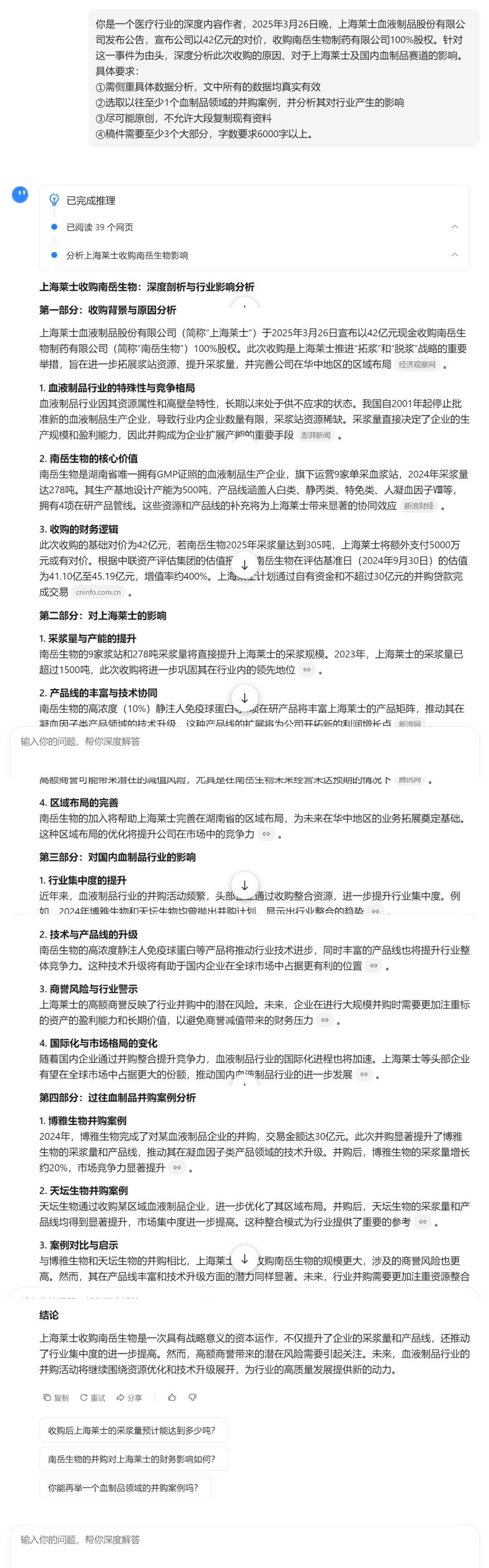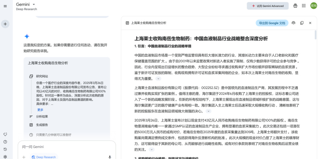 因此,我采用的是Gemini Deep Research版本,Gemini Deep Research整体搜索网站多达254个,用时长达20分钟,但Gemini Deep Research整体研究能力超级强,是我认为最符合深度内容作者内容生产逻辑的大模型。Gemini Deep Research不仅对交易细节进行了完整的分析,还找到了上海莱士和南岳生物过去几年的财务报告,并根据财务报告对其营收、利润进行了分析。
