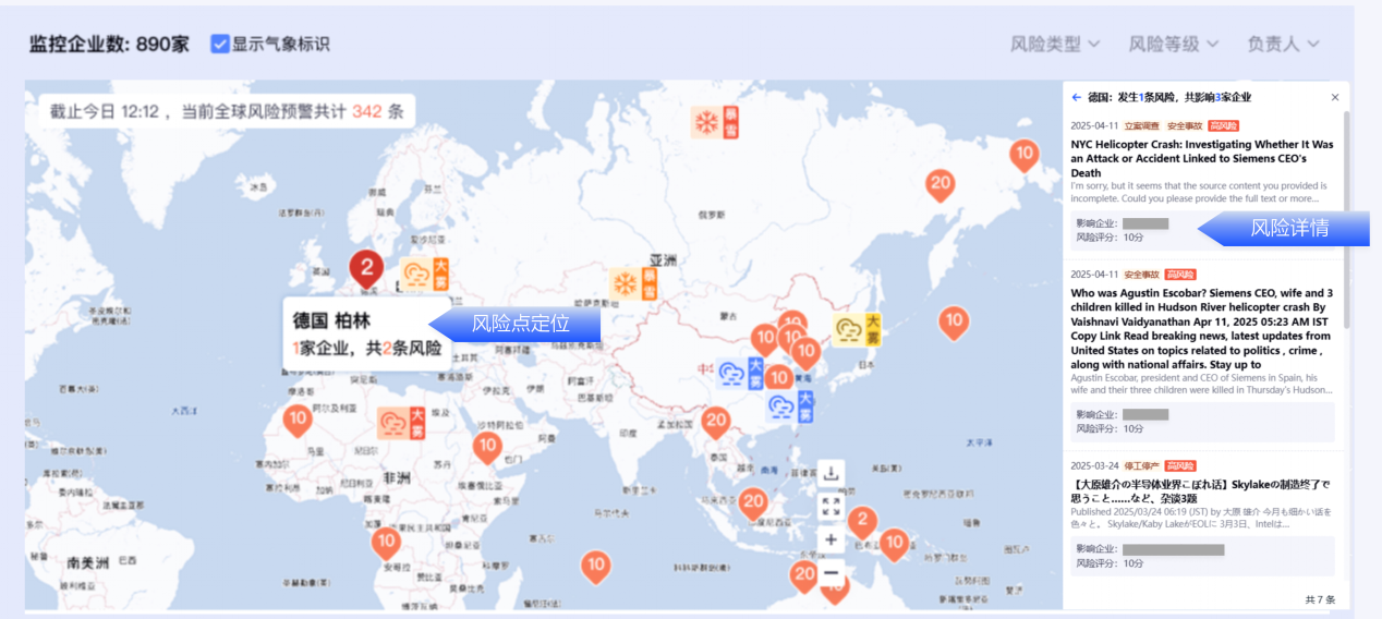 其中“世界风险地图”作为全天候智能预警平台,可将风险事件与供应商的地理位置实时关联,自动生成动态全球风险热力图,直观呈现不同区域内的风险分布情况及受影响的供应商数量。其风险监测范围覆盖全球220多个国家与地区,支持130多种语言实时翻译,接入超30万个多渠道数据源,包括各国地震局、气象局及主流媒体等,可规避原材料供应、生产经营、物流运输等181项供应中断风险,助力企业“一眼洞察全局”。