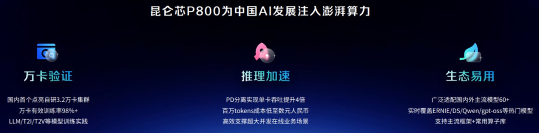其次,在推理加速方面,P800通过架构层面创新,实现单卡吞吐能力提升4倍,并将百万token推理成本降至几元级别,显著提升高并发场景下的推理性能与经济效益,真正达成“跑得快、稳、省”的落地目标。