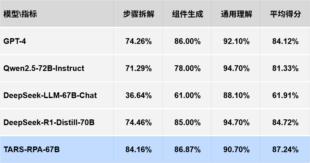 在步骤拆解和组件生成能力上,TARS大模型的准确率超过了GPT-4和DeepSeek;