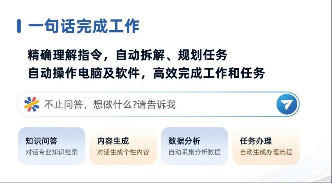 零代码交互:通过快捷键(Ctrl+SPACE)一键唤醒,支持语音、文本、文件拖拽三种交互方式,用户只需自然语言描述需求,即可完成从任务拆解到执行的全流程。