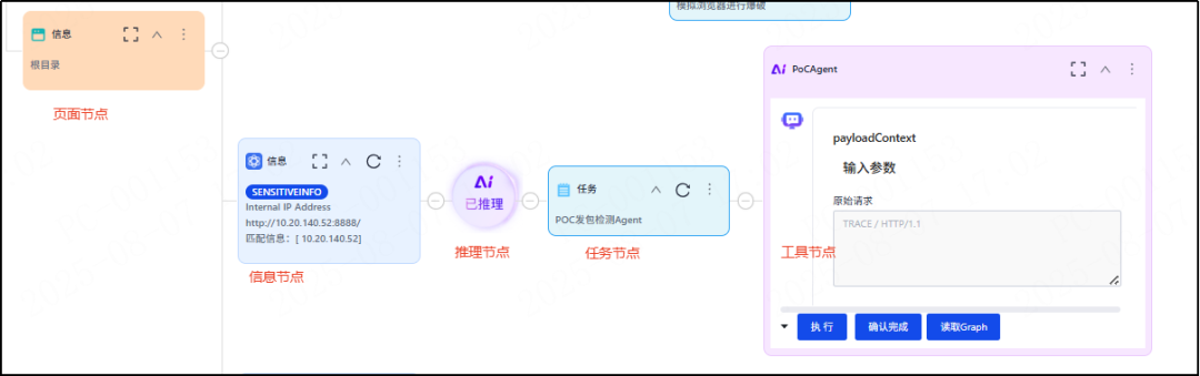 AI会根据信息节点的内容,自动通过知识库查询,推理出下一步的渗透任务,并由AI自动调用起最匹配的工具。工具可以快速执行,执行完毕后,AI可以针对其执行结果,进一步推理规划下一步任务和工具,直至该路径渗透验证结束。