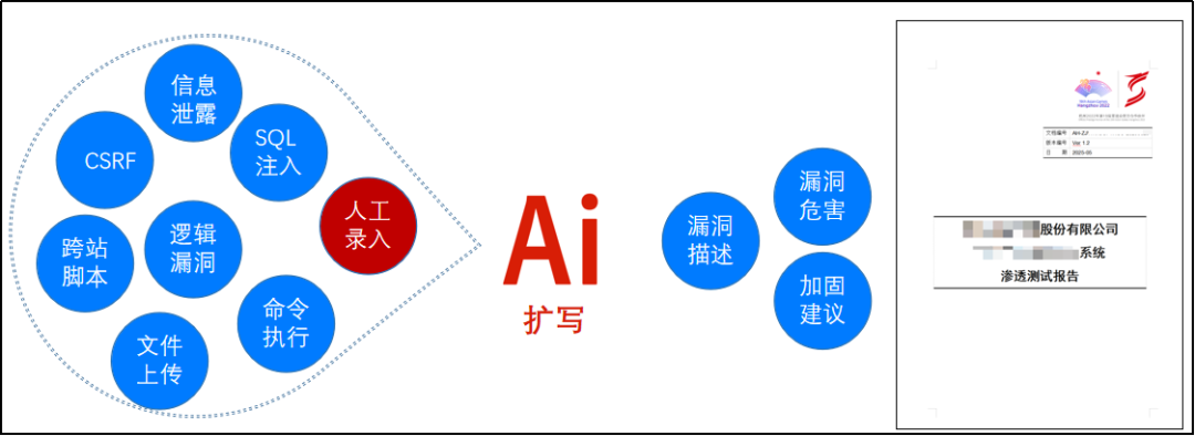 通过大模型,自动分析各类扫描工具的扫描结果(或者是人工录入的简单漏洞描述),自动生成相应的漏洞描述、漏洞危害、加固建议等专业内容,根据报告模板,一键生成标准化的测试报告。