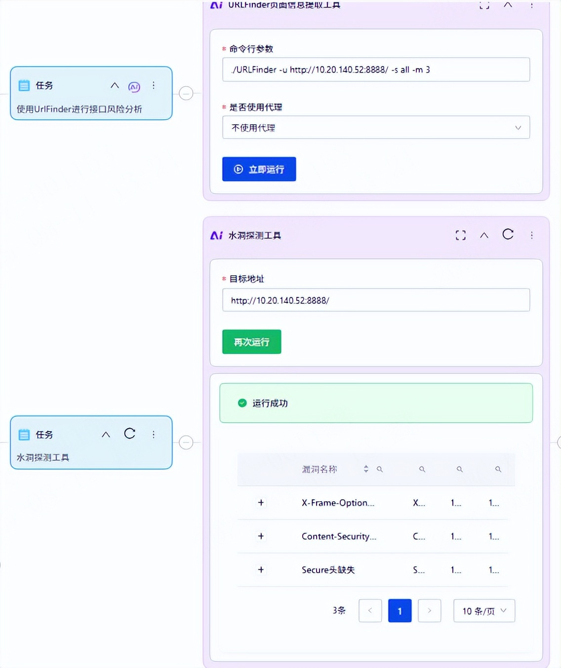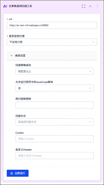 以“全策略漏洞扫描工具为例”,首先AI会根据渗透上下文,自动配置参数(例如下图中的“url”参数)。人工也可以在此基础上进行修改。