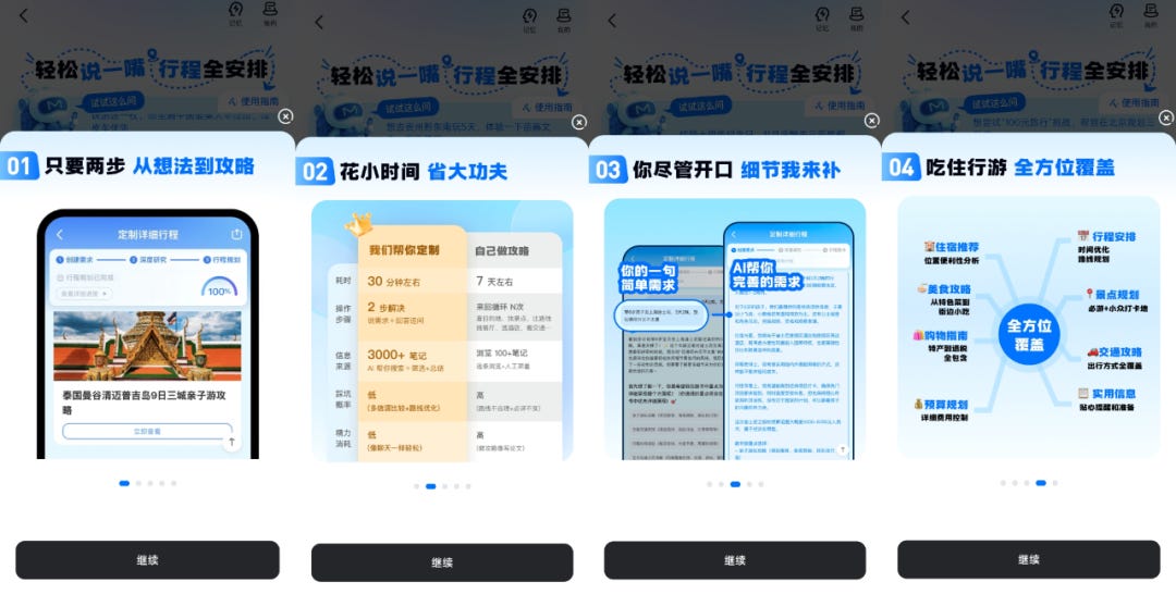 AI行程规划是庞大UGC(用户生成内容)和PGC(专业生成内容)生态的“智能出口”。将静态的攻略、点评、笔记转化为动态、可执行的行动计划,盘活了内容资产,使其产生直接的应用价值。生成的行程中,会基于用户需求和行程上下文进行相关产品推荐,为核心商业模式提供了更高效、更精准的转化路径。