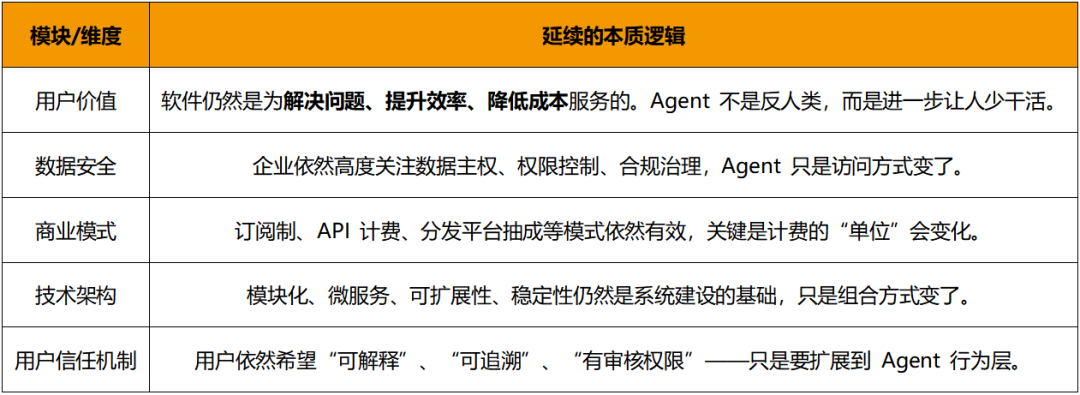事实上,Agent并不是把旧世界一夜推翻,它更像是一次“底层逻辑重构+表层语义翻译”。有些核心价值仍然成立,但支撑这些价值的实现方式、接口机制、系统架构正在发生根本变化。
