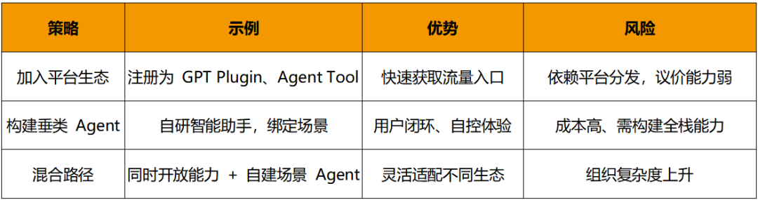 Agent化是一次系统性的范式迁移,厂商不能只做“适配”,而要做“重构”:构建可调度、可组合、可状态管理的能力模块;接入或自建Agent编排平台;在平台间取得“能见度”与“调用优先级”;重塑组织协作模型,为智能系统服务而非为界面服务。