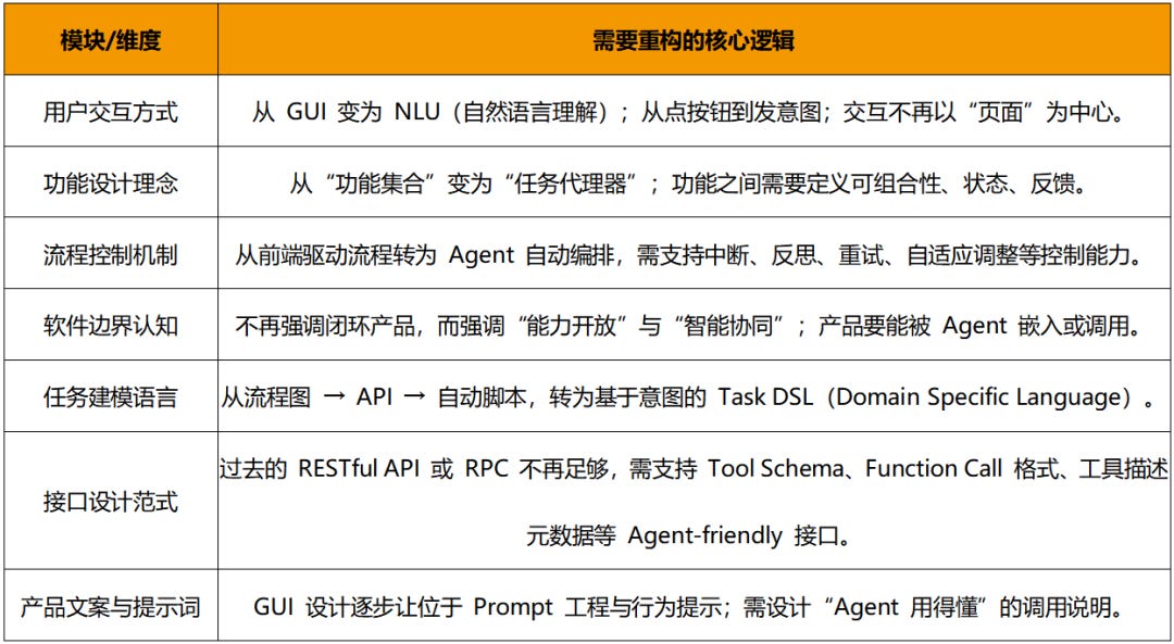• 软件产品不再是一个有界面的“页面堆叠体”,而是一个被Agent调用的“能力模块”;