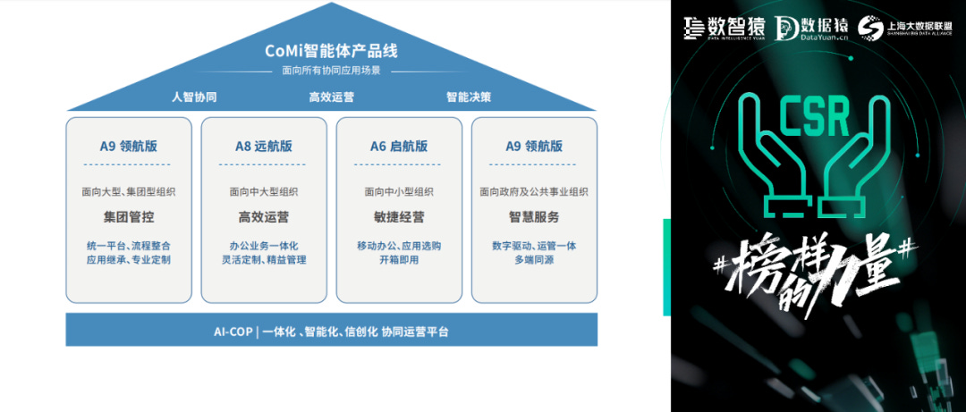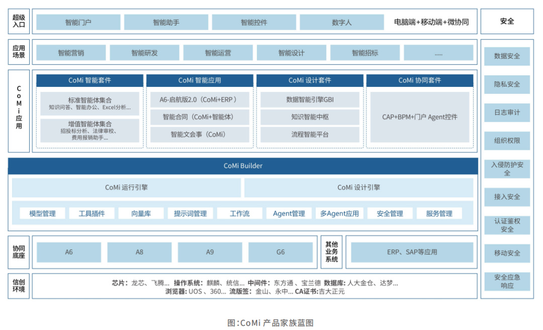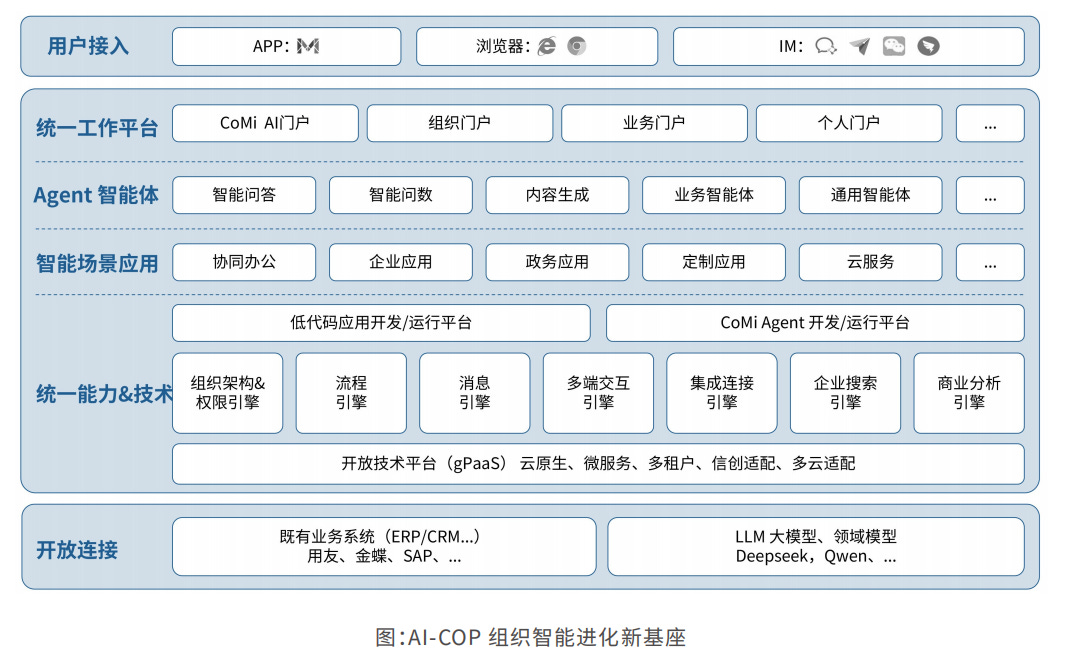 AI-COP平台是人工智能时代协同运营理论的核心引擎,通过将AI技术与协同运营平台深度融合,构建人智协同的新范式。CoMi产品家族是AI-COP平台的核心AI能力产品体系,是致远互联使能组织实现AI原生化转型关键引擎。