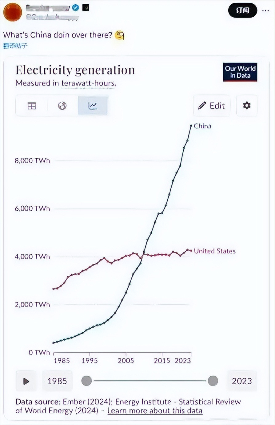 马斯克曾在社交平台分享过一张图,展示了中美两国发电量的增长情况。相比于中国陡峭的增长曲线,美国这么多年来发电量基本保持稳定,波动不大。